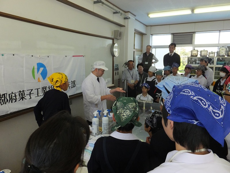京都府菓子工業組合青年部は10月14日(水)に京都市立烏丸中学校にて、39名の二年生の生徒さん達と共にお菓子作りを実施致しました。