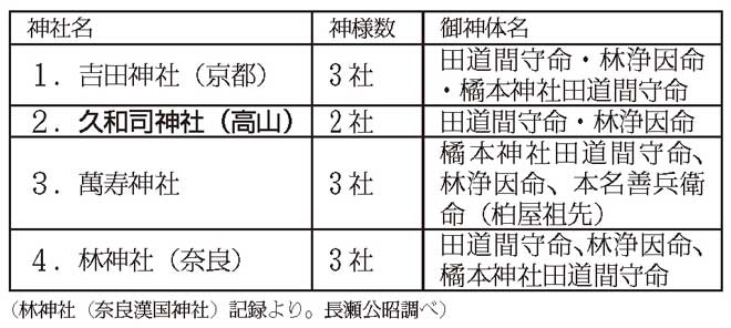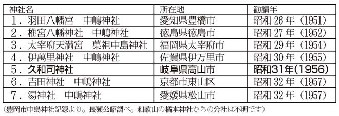 また、林浄因命の御分霊が遷座された神社は、下記の4つです。全国に2つ以上のお菓子の神様をお祀りしている神社は4か所しかなく、中部地方では私どもの久和司神社が唯一であることが判明しました。