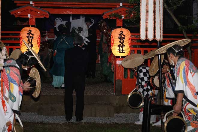 今回行った正遷座祭は、神様を正式に鎮座するお祭りです。祭典には組合員の他、飛騨高山に伝わる飛騨総社の獅子舞、秋の高山祭で有名な桜山八幡宮の闘鶏楽の皆さん、春の高山祭で有名な日枝神社で奉仕する日枝雅楽会の皆さんにご奉納いただきました。行列では組合員が松明係や旗持ちなどを務め、隣接する社殿に神様を遷座しました。