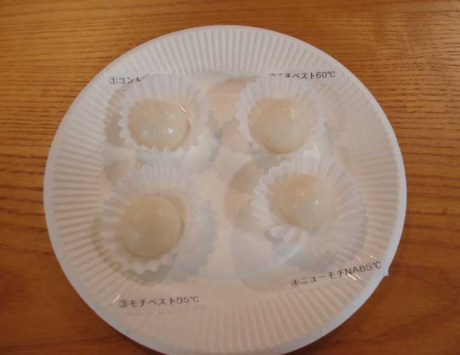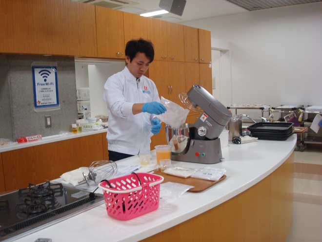 さて、講習会の内容ですが、今回は理研ビタミン株式会社様にご協力いただき講師に食品改良剤開発部アプリケーションセンター第2グループの梅田明宏様を迎え、補助員として同開発部久下様、宮本様、加工用食品第2部植田様を派遣してもらい、下記の内容で実施いたしました。今回洋菓子分野は起泡剤・和菓子分野は老化防止剤を使用した製品をテーマにしたものです。