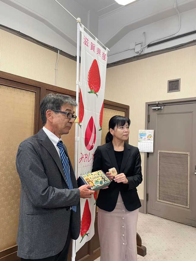 あさひかわ菓子博覧会のサンプリングイベントでは滋賀県の商工労働部の方々と共に国スポ・障スポのPRをさせていただき、9月24日には滋賀県商工労働部長、農政水産部長そして副知事を表敬訪問させていただき「餅の恵 mio」のプレス発表をさせていただきました。10月25日~27日の滋賀障スポの会場で組合員の皆様のお菓子と共に販売致します。今後、「みおしずく」の最中種の焼き型を作成し、組合員の方々に活用いただき「みおしずく」を活用した新しい滋賀県のお土産品になれば幸いです。