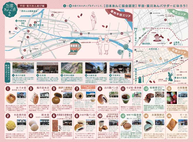 出雲菓子協会では昨年に続き、2回目となる「出雲あんこ旅2~平田・斐川あん結び編~」を開催しました。このイベントは、出雲市内の和菓子店、洋菓子店、製パン店、飲食店が提供する〝あんこスイーツ〟を巡るスタンプラリーです。昨年は平田地区限定でしたが、今年は斐川地区にもエリアを拡大し、全16店舗・16種類のあんこスイーツに挑戦できる内容となりました。主催は出雲菓子協会と平田菓子同業組合、監修は日本あんこ協会(にしいあんこ会長)。開催期間は2025年10月1日~11月30日の2か月間です。