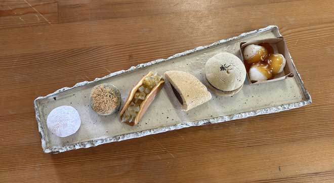 講習内容は、「香り蓬餅」「月ひめ(抹茶)」「和れっと」「五香袱紗」「苺生クリーム大福」「みたらし団子(冷凍可能)」の6種類の和菓子。これらを鹿児島ならではのお茶、お芋、黒糖等を用いたお菓子として工夫してくださいました。