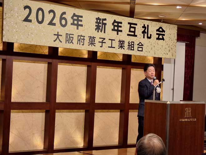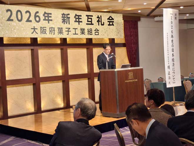 大阪府菓子工業組合(野村泰弘理事長)では、令和8年1月20日(火)「2026年新年互例会」を開催(於リーガロイヤルホテル大阪)。開会に先立ち、「新春特別記念講演」を企画、講師に日本経済新聞社大阪本社経済部長堤正治氏を迎え、「2026年度の日本経済について」と題してご講演いただいた。